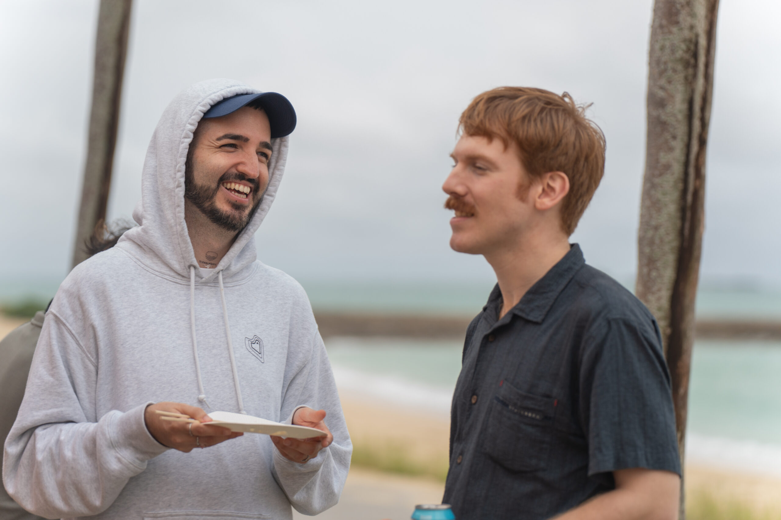 それぞれが充実した時間を過ごした後、ビーチに全員集合して待ちに待ったBBQ!…のはずが、11月下旬の沖縄の空は気まぐれ。強風と雨に見舞われ、気温もぐっと下がってしまいました。
