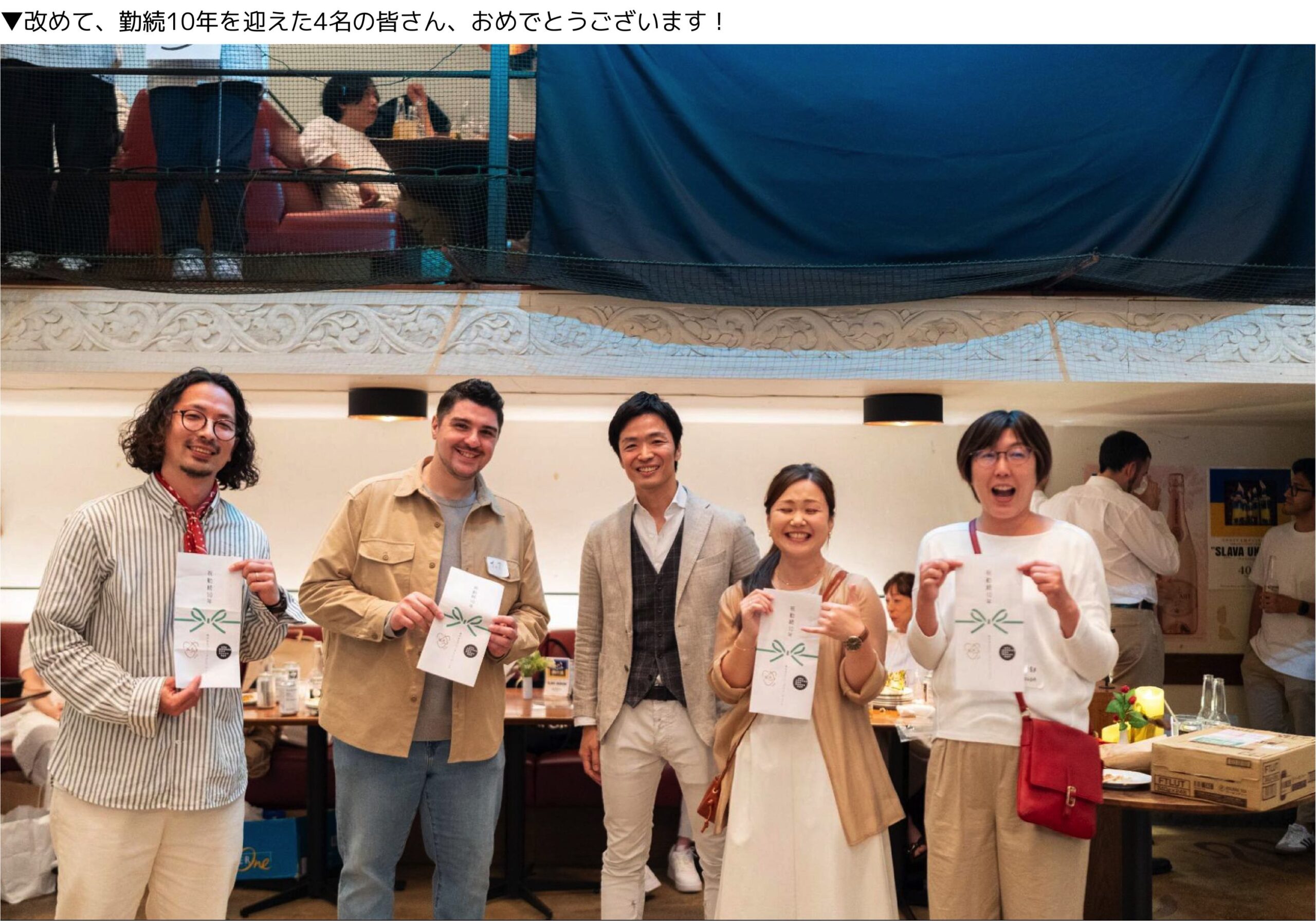 今回は4名の方が対象となり、社長から一人ひとりとの思い出や、この10年間への感謝のメッセージと共に祝いの品が贈呈されました。