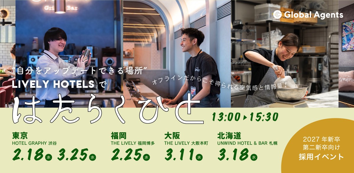 グローバルエージェンツでは、ライフスタイルホテルチェーン 「LIVELY HOTELS(ライブリーホテルズ)」 のさらなる事業拡大に向け、2027年卒入社予定者を対象とした【新卒第2期生】の採用をスタートします。