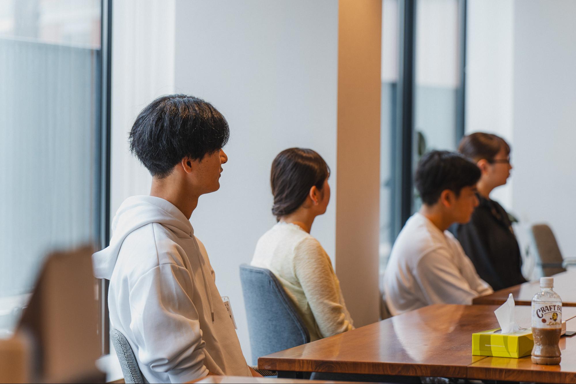 少し緊張した表情を浮かべながら、内定者の皆さんが入室してきました。GAでは働く上で身なりの制限はほとんど設けず、「個性を活かして自分らしく等身大で働く」ことを大切にしています。この日も同様に、服装や髪型、ネイルなどの制限は設けず、自分らしいスタイルで参加してもらいました。