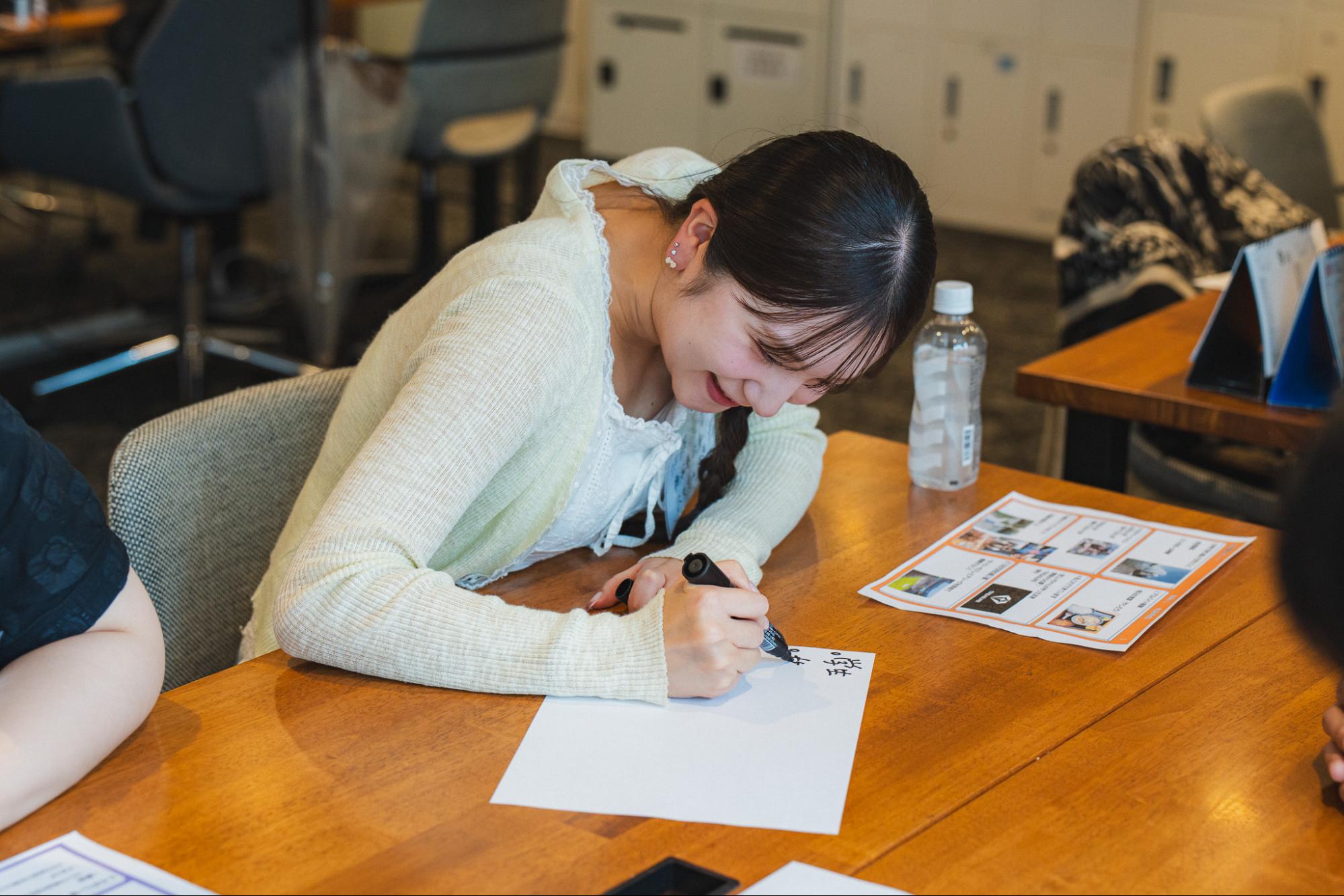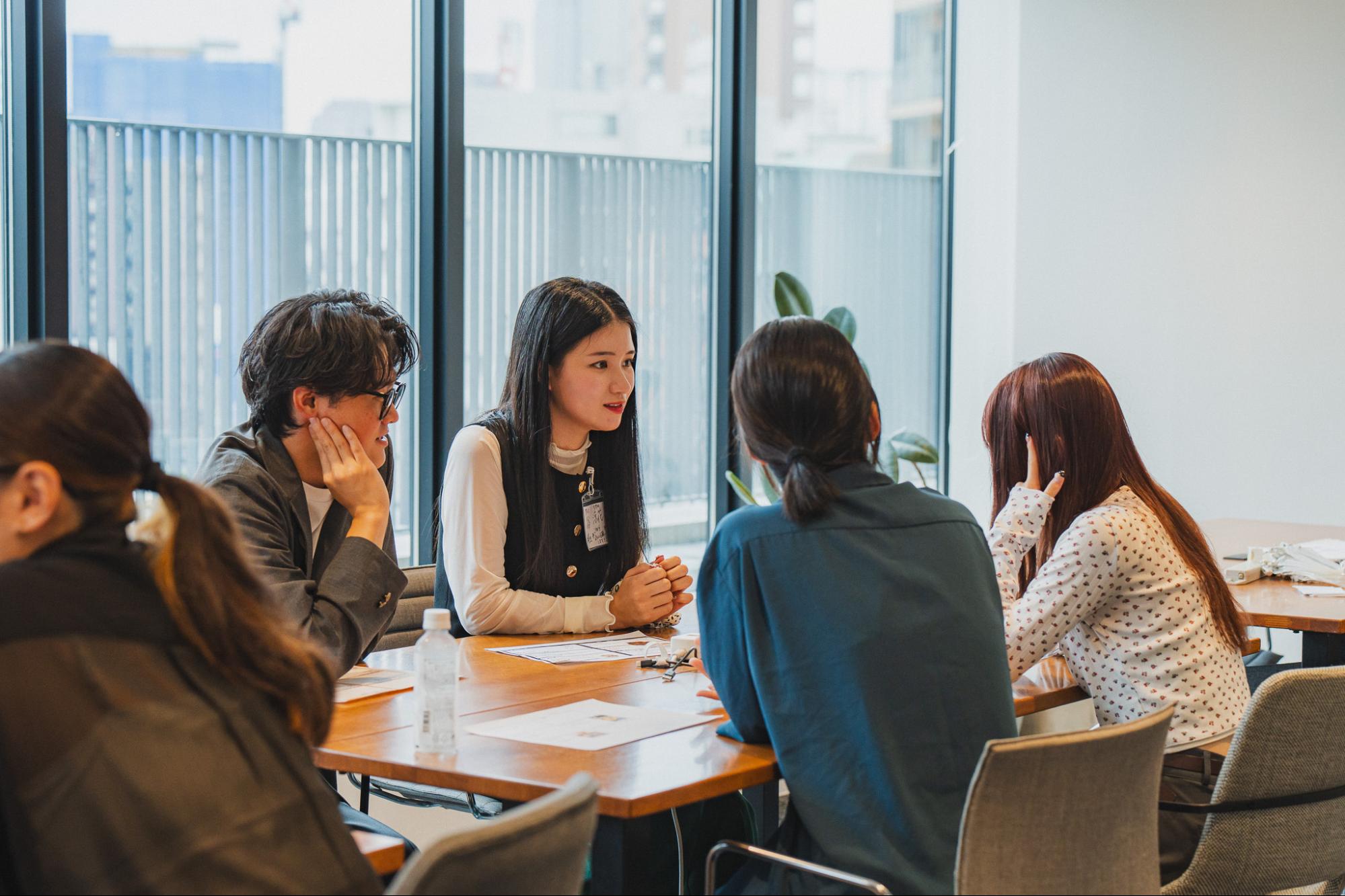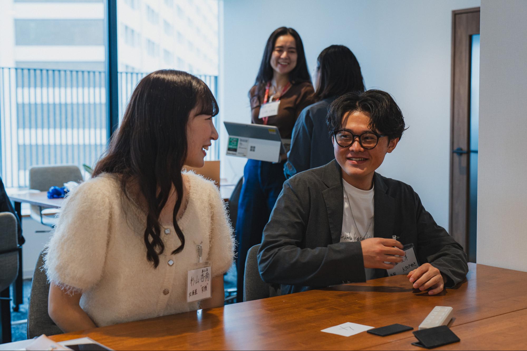 チーム内で共通点を探すゲームが始まると、自然と笑顔があふれ、あちこちから楽しそうな声が聞こえてきます。「え、私もそれ好きです!」と笑顔で話す内定者や、真剣な表情でカードを見比べながら共通点を探す姿も。チーム全員がチーズケーキ好きだと判明した瞬間は、思わず拍手が!何気ないことかもしれませんが、自発的に思わぬ偶然の共通点を見つけられたときは、誰もが嬉しくなるものです。