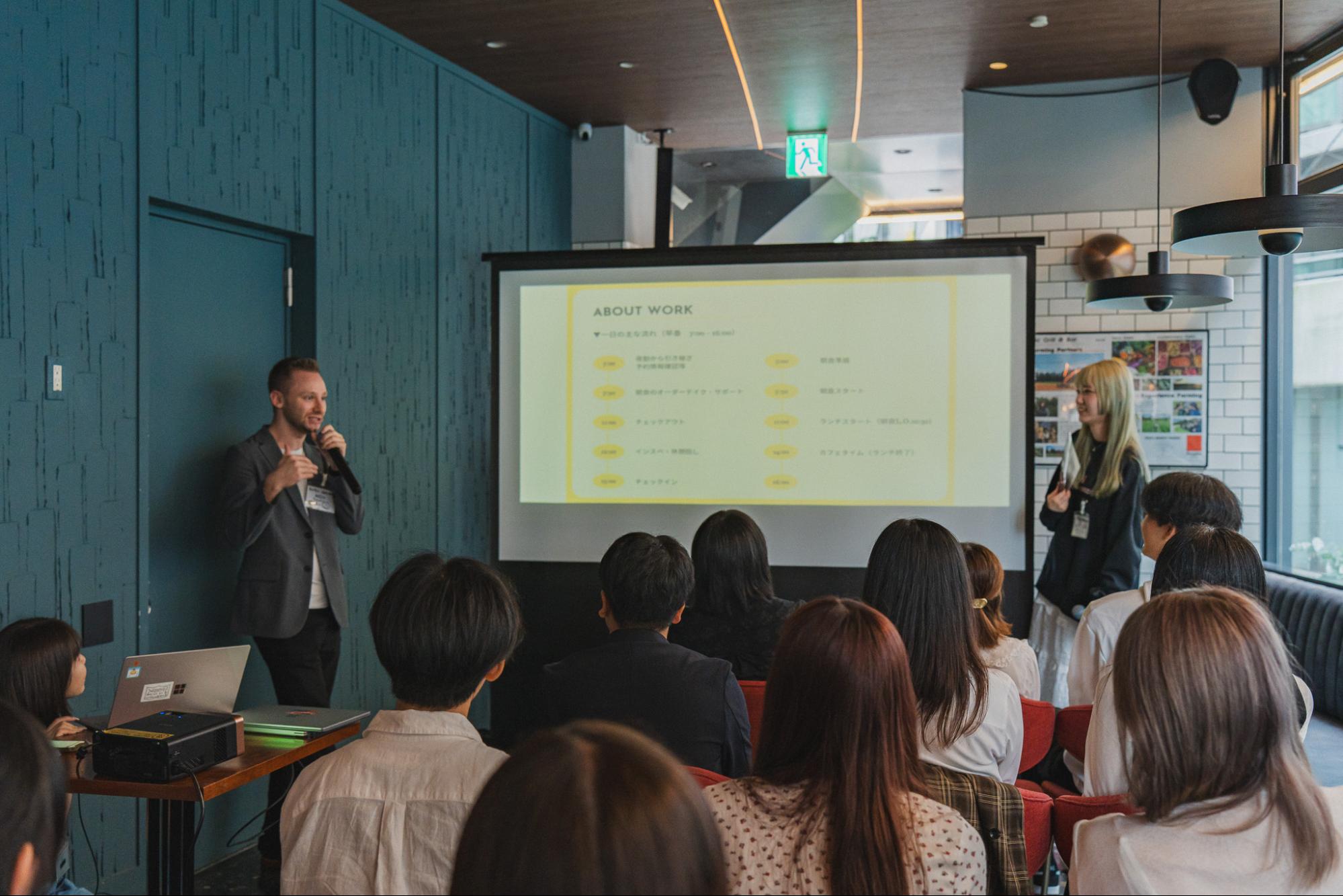 ランチを楽しんだあとは、「Graphic Grill & Bar」で、LIVELY HOTELS(ライブリーホテルズ)のスタッフによる施設紹介が行われました。北海道から沖縄まで全国各地の施設で働くスタッフたちがこの日のために集まり、内定者へ向けて現場の様子やサービス内容を紹介してくれました。